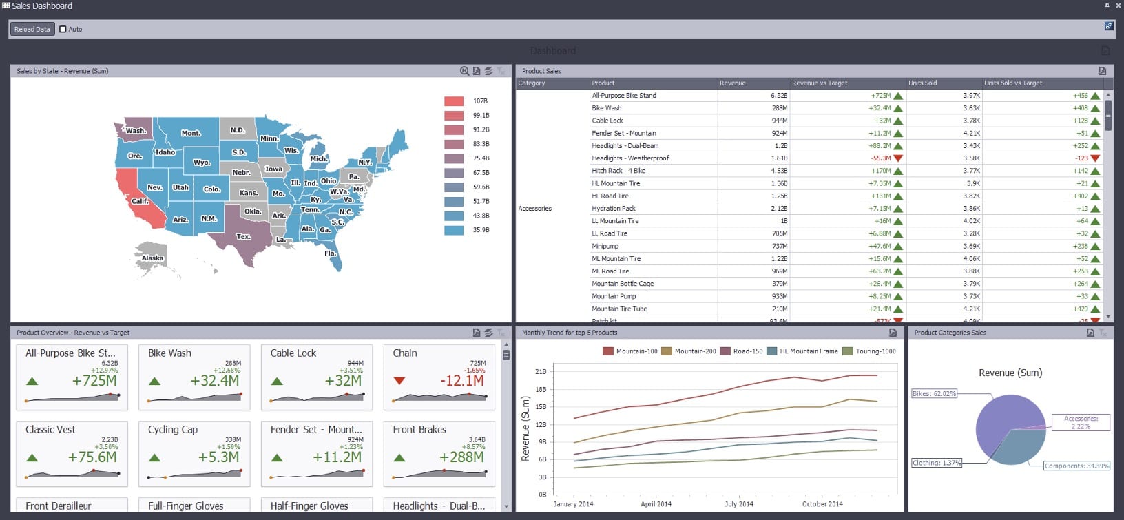 Aggregates sales data within interactive dashboard to show trending and comparison across products, categories and regions of revenue and units sold against targets. Clicking on state, graph component, card or grid record(s) dynamically updates and filters aggregated data..