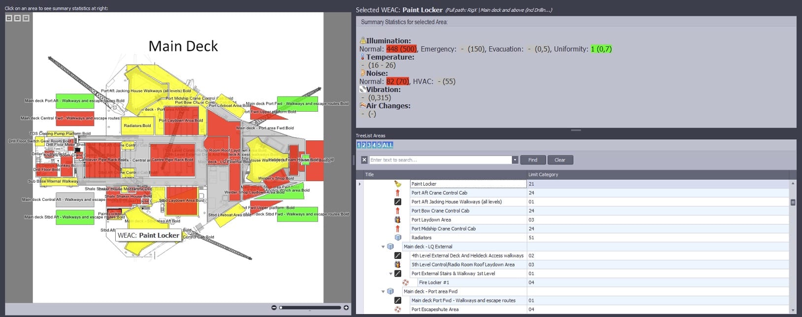 Visually shows health, safety and environmental compliance via color coding on a bitmap schematic, in this case an oil rig platform. Clicking on that polygon on the image navigates the user to relevant data.