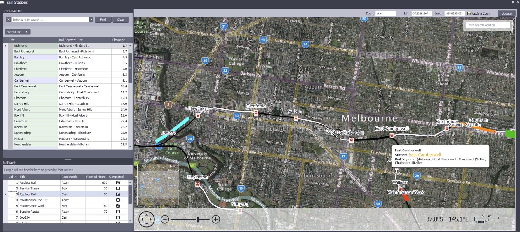 Ties Geographic Information (GIS) to data, in this case train stations as a background overlay on the map and railway maintenance work as a foreground overlay with tooltips. This can easily be applied to roadways, environmental data sets and oil & gas to integrate any kind of data into a map.